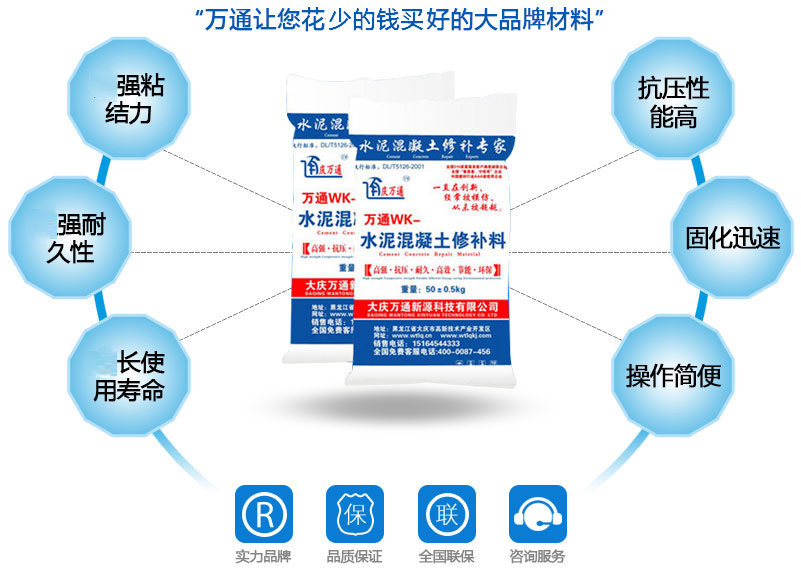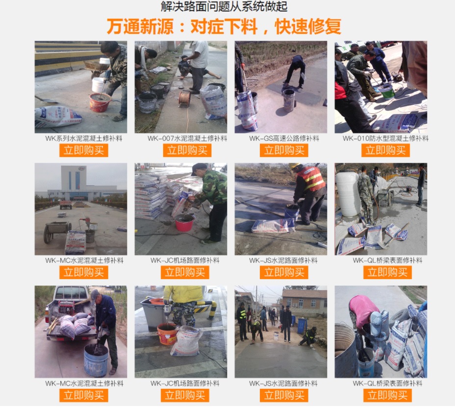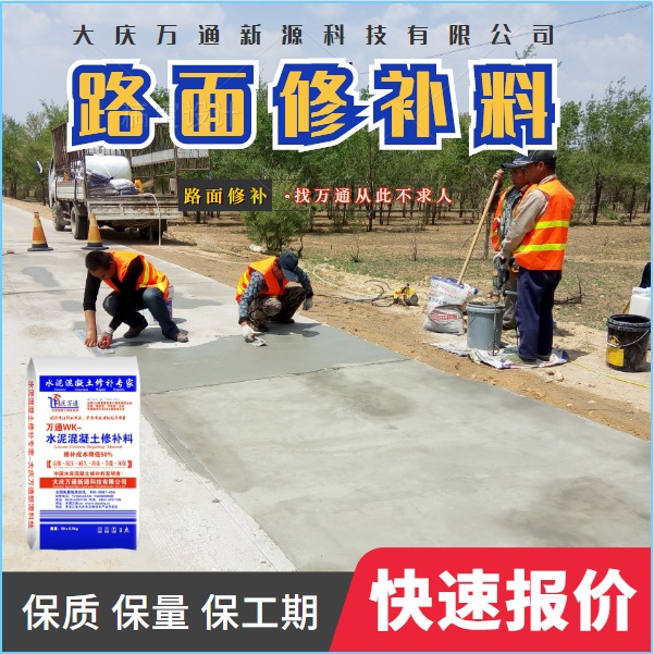 大慶萬通新源科技有限公司獨有的混凝土路面高強速補料,是水泥混凝土路面病害修復(fù)的好材料。疲勞、凍融循環(huán)、彎曲壓力、滲水和基層破壞等原因都會引起水泥路面的破損,從而帶來高昂的維護費用。與以往的剛性修補方法不同,混凝土水泥路面維修速補膠提供了一種獨特的柔性修補產(chǎn)品和技術(shù),高柔性、高抗拉性,可跨伸縮縫施工和高抗壓性使得混凝土快補產(chǎn)品為水泥混凝土路面提供了******性的修補。傳統(tǒng)的剛性修補方案,如環(huán)氧砂漿和快干水泥產(chǎn)品,由于其自身的粘結(jié)失效,抗疲勞性低以及與原路面不同的伸縮系數(shù),修補面會在短時間內(nèi)失效或產(chǎn)生新的裂縫,需要反復(fù)修補,有效期短且費用高昂。大慶萬通新源科技有限公司的混凝土水泥路面維修速補膠可以隨原路面一起伸縮,移動,從而避免了粘結(jié)失效和產(chǎn)生新裂縫。萬通快補產(chǎn)品優(yōu)異的粘結(jié)性、柔韌性和高防滑性,特別適用于水泥路面的淺層粘合修補,多邊角混凝土板層修補,跨伸縮縫修補以及路面沉陷修補。萬通混凝土病害修補料針對混凝土起皮起沙、斷板裂縫、蜂窩麻面、坑槽露石子、漏筋掉皮、橋梁的掉皮漏筋快速通車使用時間長。應(yīng)用萬通快補產(chǎn)品,施工后一天就可以恢復(fù)交通。大慶萬通新源科技有限公司的萬通水泥路面維修速補膠適用于高速公路、機場路面、農(nóng)村村村通路面、廠坪、學(xué)校操場、市區(qū)公路、小區(qū)路面、橋梁、水泥路面的修補。使用萬通特快補材料修補路面可以一勞永逸! 水泥地面起砂怎么辦,混凝土修補劑混凝土地面起砂,混凝土地面修補,地面起砂怎么辦,